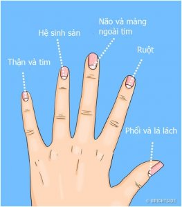 - Liềm móng tay trên ngón tay cái: phản ánh hoạt động của phổi và lá lách. Một liềm móng tay bình thường chiếm không quá 25% diện tích móng tay. Liềm móng tay có thể có kích thước nhỏ hơn đáng kể ở người hút thuốc lá hoặc lớn hơn khi có tình trạng tăng huyết áp động mạch.