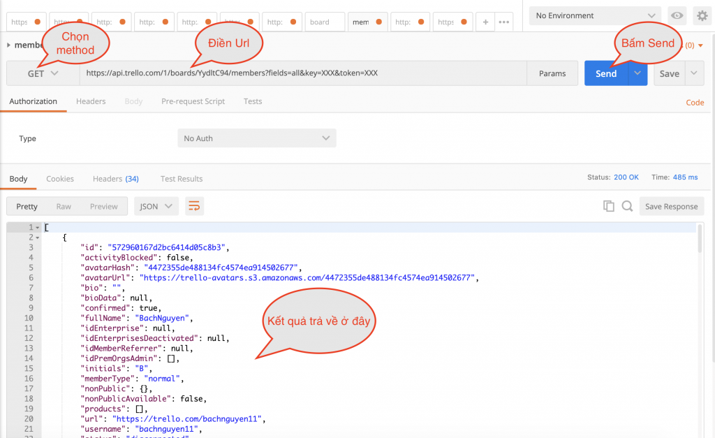 Các bước tạo 1 request cơ bản: chọn method, điền url, nếu cần thiết thì điền thêm các trường ở header, body rồi nhấn Send rồi chờ kết quả trả về ở bên dưới thôi