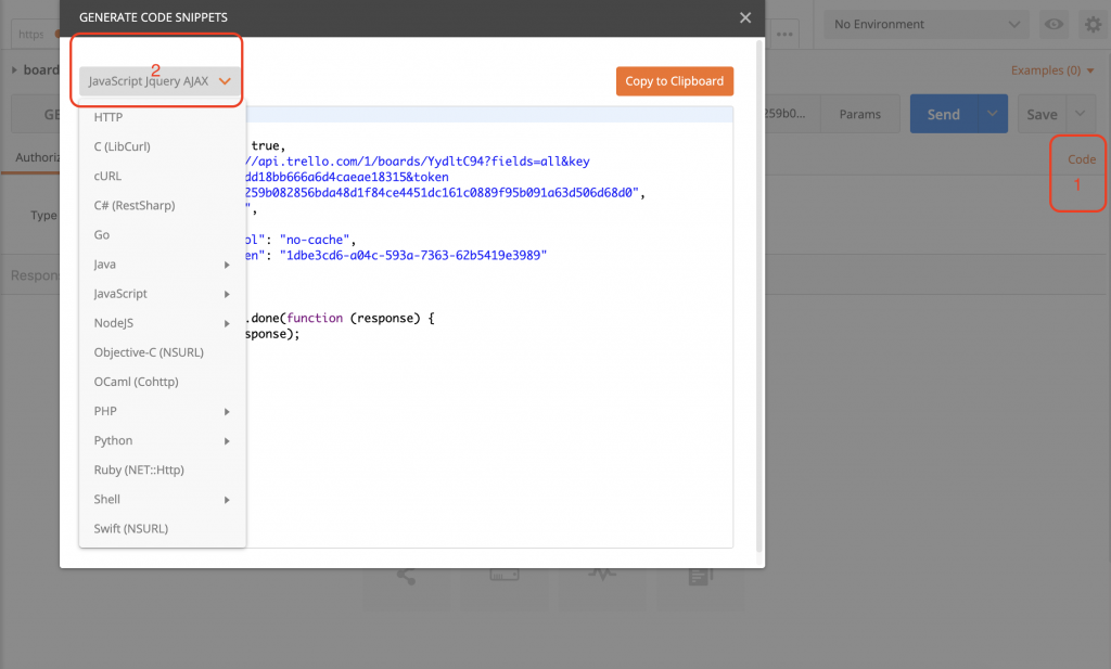 Đối với developer, sau khi đã test thành công API trên Postman, vẫn còn một bước quan trọng và tốn kha khá thời gian đó là convert những gì vừa test thành mã code. Thật may, Postman đã xây dựng sẵn chức năng này, người dùng sau khi test xong API trên Postman chỉ cần thêm một vài thao tác đơn giản là có thể lấy được mã code mình mong muốn. Hiện tại Postman đã hỗ trợ generate ra khá nhiều ngôn ngữ lập trình: C, C#, Java, PHP, Go, Javascript, Python,… Các bạn chỉ cần làm theo các bước: Test thử API như bình thường, nếu như API chạy tốt, bạn bấm vào nút “Code” ở bên phải màn hình, rồi chọn ngôn ngữ mà bạn muốn generate code. Đến đây code đã được show ra, việc của ta chỉ cần bôi đen đoạn code muốn chạy rồi copy hoặc bấm vào “Copy to Clipboard” là xong.