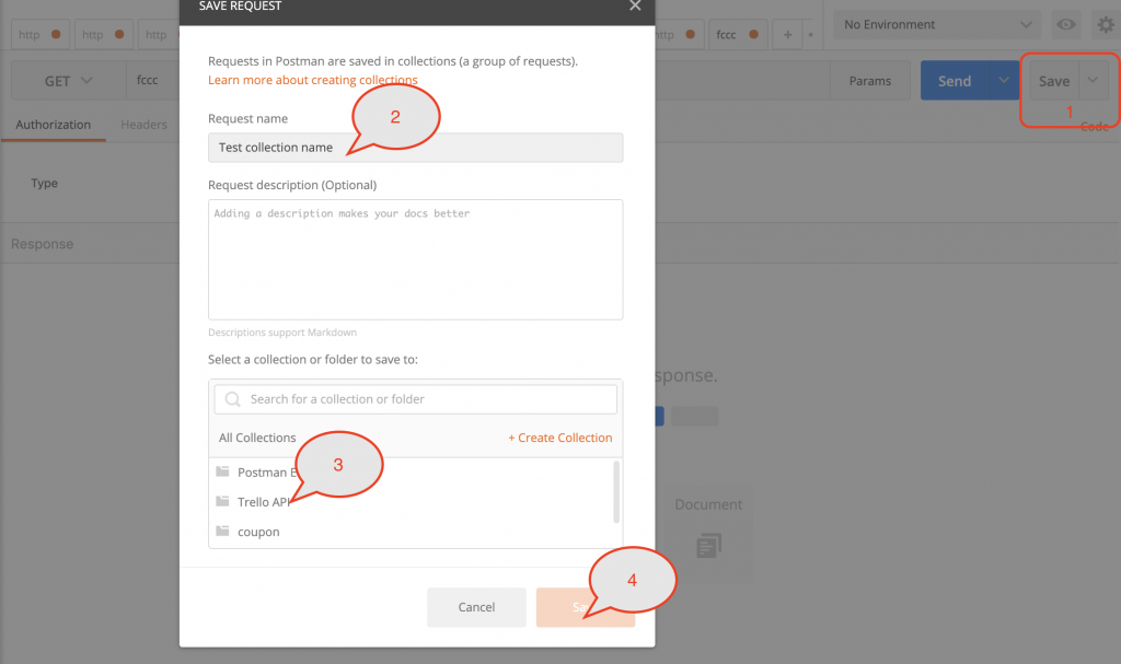 - Chọn collection sẽ chứa request, có thể tạo một collection mới ở bước này