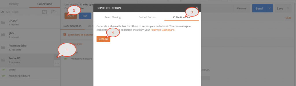 Ngoài ra, nếu bạn muốn share collection cho người khác, mà không muốn mất công tạo collection và các request từ đầu, Posman cung cấp chức năng share collection. Có khá nhiều cách để làm việc này như: export collection ra file rồi gửi cho người đó import vào, Team sharing (mất phí), Embed Button,… nhưng mình sẽ giới thiệu tới mọi người cách đơn giản mà mình hay dùng nhất đó là: Get Collection Link. Các bạn thực hiện theo thứ tự ở hình bên dưới nhé