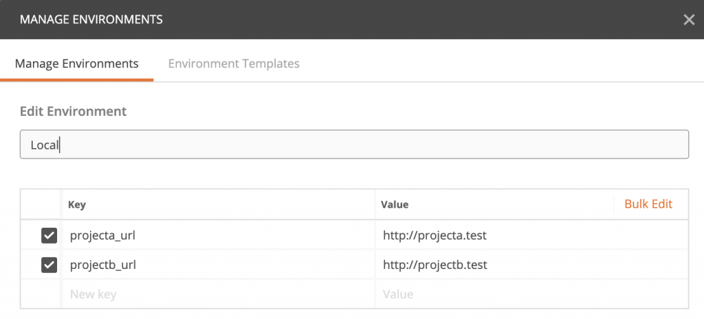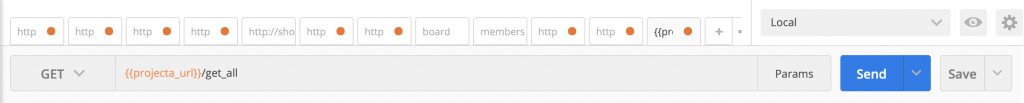 Tạo thêm các Environments tương ứng ví dụ là Staging và Production và đổi sang các url tương ứng với nó. Sau đấy trong mỗi request ta chỉ cần khai báo biến {{projecta_url}} và chọn môi trường mà bạn muốn test. Ví dụ ở môi trường Local: {{projecta_url}}/get_all sẽ được Postman hiểu là: http://projecta.test/get_all